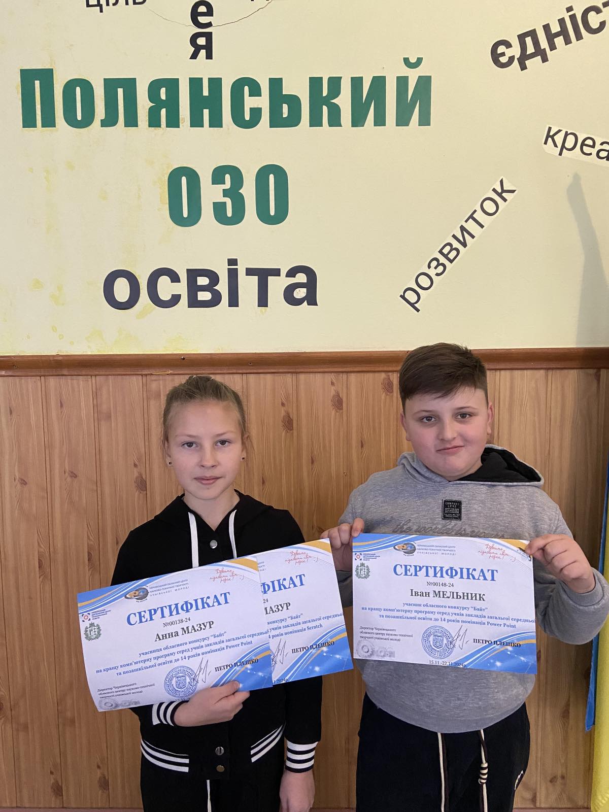 – молодша вікова категорія за ІІ місце: Івана МЕЛЬНИКА, учня ОЗО «Полянський ЗЗСО І-ІІІ ст. – ЗДО» (керівник – Василь МАЗУР);