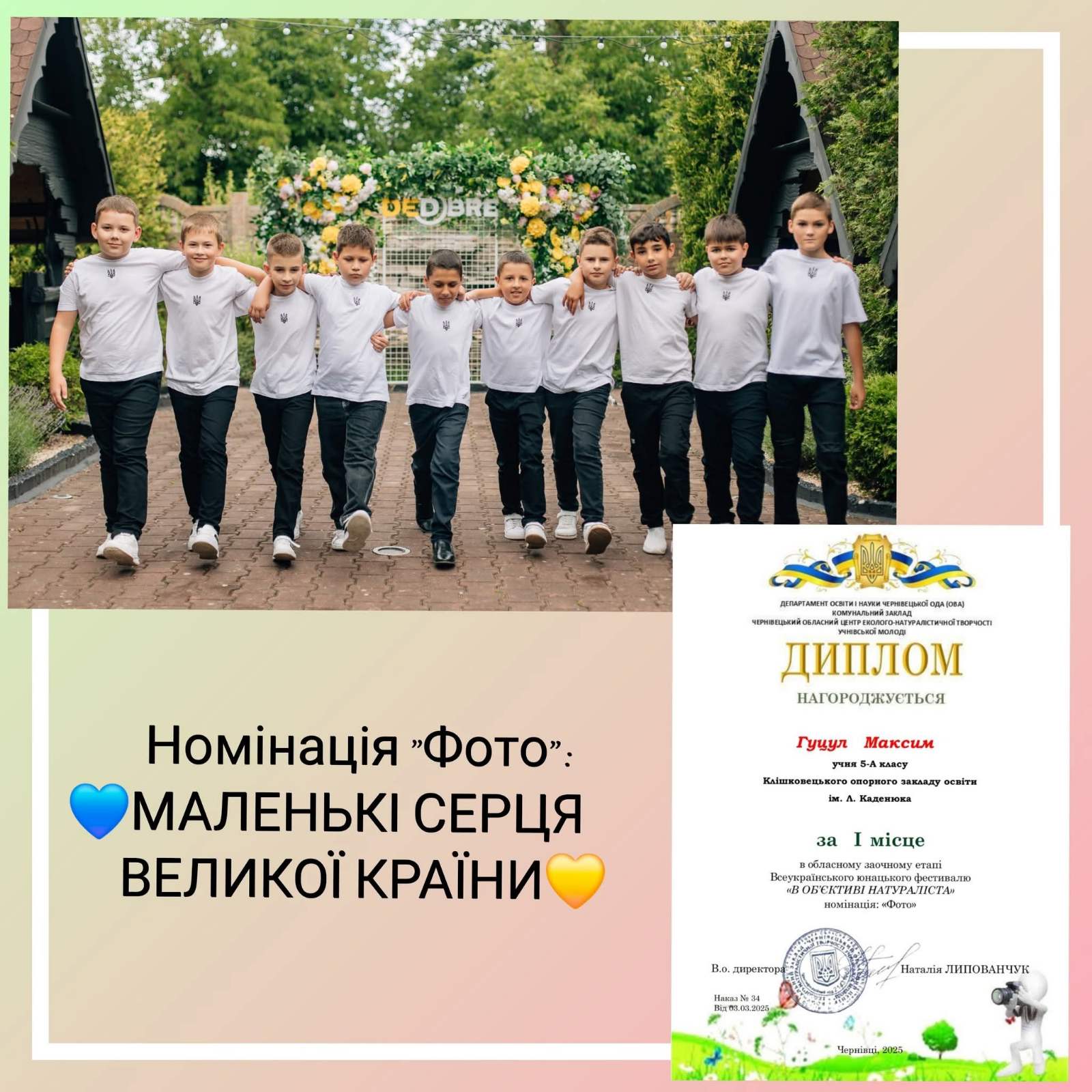 в номінації «Фото» – Гуцула Максима, учня Клішковецького опорного закладу освіти імені Леоніда Каденюка (керівник проєкту – Гуцул О.В.).