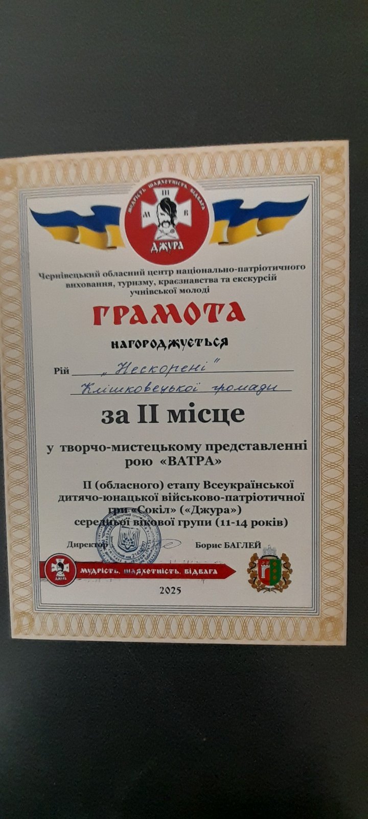 Рій «Яструби» ОЗО «Клішковецький ЗЗСО І-ІІІ ступенів» (виховники – Сергій Харицький, Олег Горобець, Світлана Палагнюк) нагороджені дипломами за ІІ місце у Творчо-мистецькому представленні рою «Ватра»; за ІІІ місце у конкурсі строю та маршової пісні «Впоряд»; за ІІІ місце у конкурсі «Рятівник».