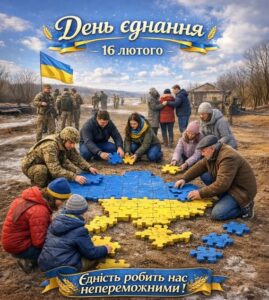 16 лютого Україна відзначає День єднання. Його президент України Володимир Зеленський заснував 16 лютого 2022 року на тлі попереджень про можливу війну. День Єднання – це не просто чергова дата у календарі, а нагадування про силу єдності перед викликами. Це день, коли кожен українець може замислитися над тим, як він особисто може зміцнити державу, допомогти ближньому та зробити внесок у спільну перемогу. Адже справжня сила нації – у її згуртованості, взаємопідтримці та вірі у власне майбутнє.