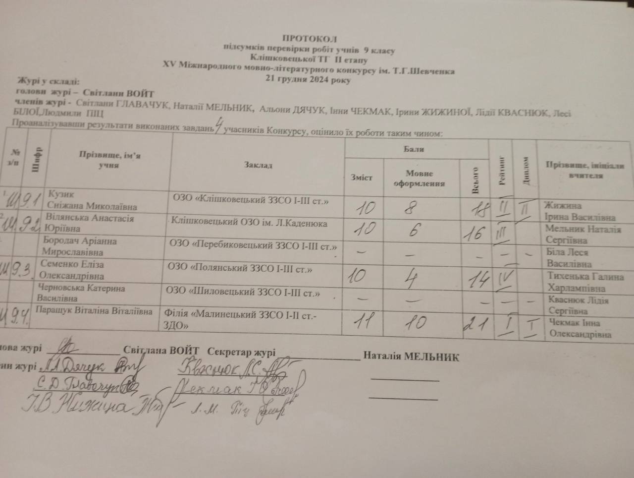 Остаточні результати засідання журі ІІ етапу ХV Міжнародного мовно-літературного конкурсу ім. Т. Г. Шевченка Автор Ленюк Олена · Опубліковано 22 Грудня, 2024