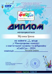 Вітаємо з яскравою перемогою Ірину МУЗИКУ, ученицю 11 класу Кліщковецького ОЗО ім. Леоніда Каденюка (керівник – Горбатюк К.М.), яку нагороджено Дипломом за ІІІ місце у номінації «Растрова графіка»