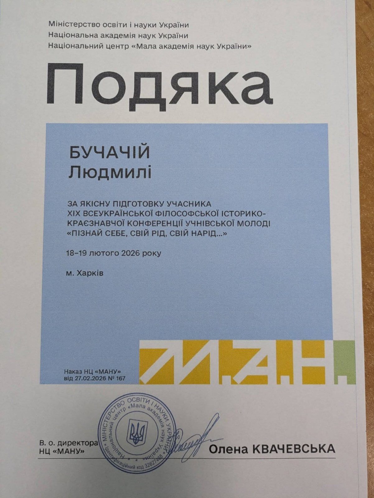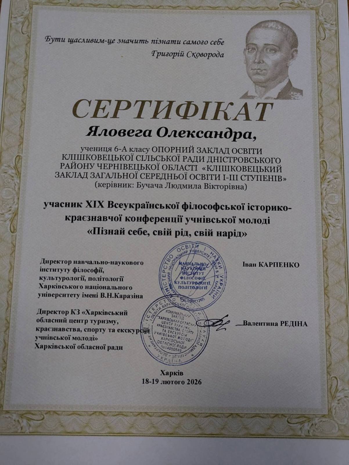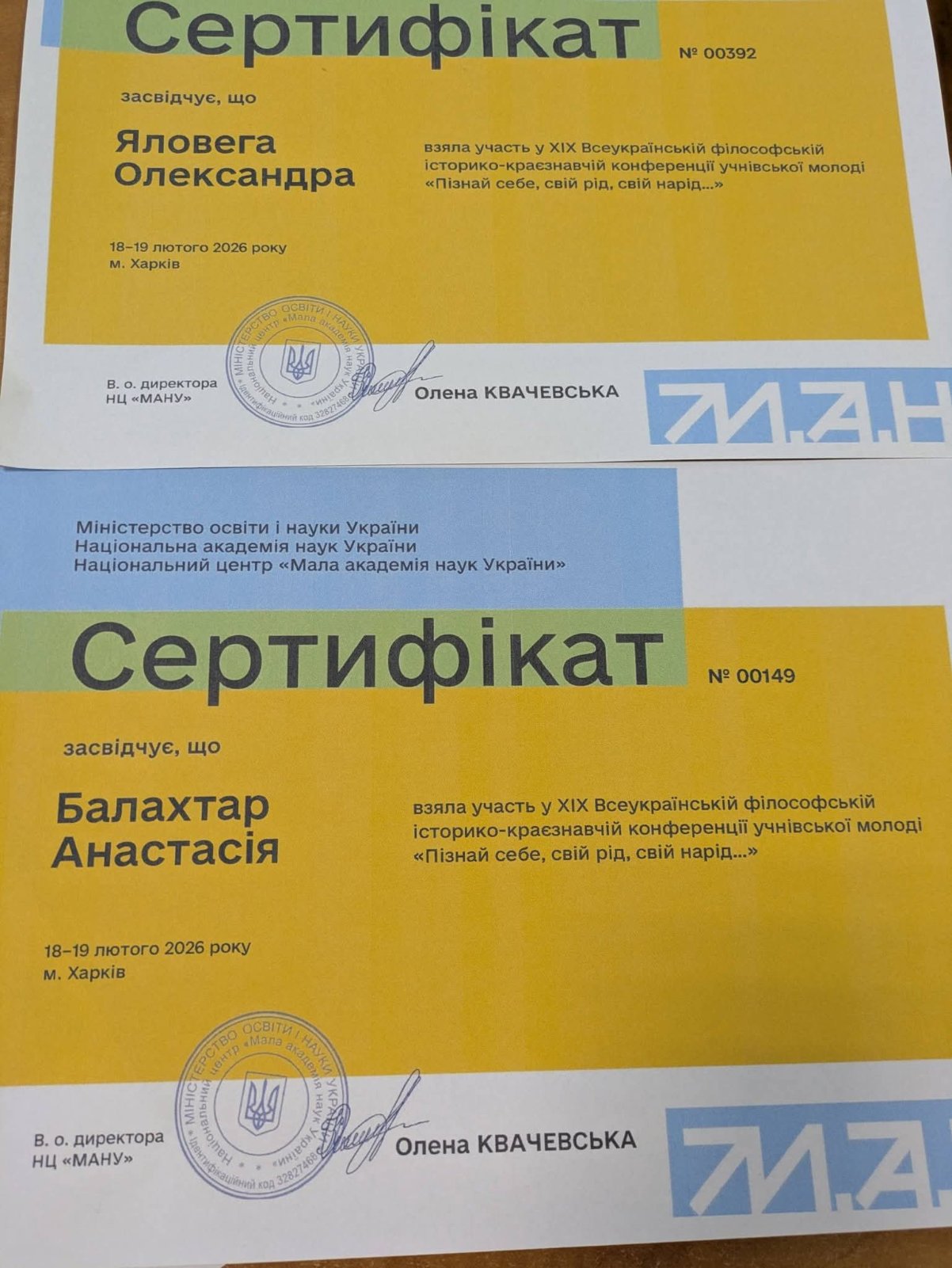 У лютому 2026 року відбулася XІХ Всеукраїнська філософська історико-краєзнавча конференція учнівської молоді «Пізнай себе, свій рід, свій нарід», подія, що об’єднала допитливих, активних і творчих здобувачів освіти навколо дослідження історичної та культурної спадщини нашої держави. Організаторами заходу виступили комунальний заклад «Харківський обласний центр туризму, краєзнавства, спорту та екскурсій учнівської молоді» Харківської обласної ради спільно з Національним центром Малої академії наук України, навчально-науковим інститутом філософії, культурології, політології Каразінського університету та Національним літературно-меморіальним музеєм Г. С. Сковороди за підтримки Департаменту освіти і науки Харківської обласної державної адміністрації. Цього року до участі в конференції було подано 241 дослідницьку роботу учнів із 24 областей України та міста Києва, серед них дослідження учнів ОЗО «Клішковецький ЗЗСО І-ІІІ ст.». Учасники обговорювали важливі філософські, історичні та краєзнавчі питання, зокрема: актуальність спадщини Григорія Сковороди в контексті сьогодення; глобальні наслідки війни для України та світу; етнографічні особливості різних регіонів; духовні скарби рідного краю; сенс життя у поглядах сучасної молоді. У конференції взяли участь Олександра ЯЛОВЕГА, учениця 6-А класу та Анастасія БАЛАХТАР, учениця 9-А класу (вчитель-наставник Людмила БУЧАЧА). Юні дослідниці відзначені сертифікатами учасників конференції, а їхній керівник отримала подяку за якісну підготовку учнів. Такі заходи допомагають молоді відкривати духовні цінності рідного краю, розвивати інтерес до історії й культури України та доводять: вивчення історії – це шлях до самопізнання і сили нації. Щиро вітаємо з успішною участю та бажаємо нових наукових звершень, цікавих відкриттів і подальших перемог.